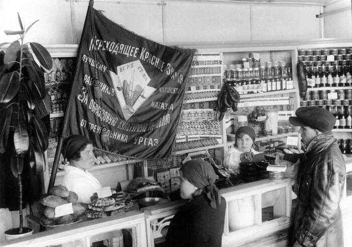 18. Гастроном автозавода им. Молотова. Ассортимент небогат, в основном самое простое и необходимое. Обращают внимание разные бутылки с алкоголем и "Переходящее Красное Знамя лучшему коллективу работников магазина". СССР, Горький (ныне Нижний Новгород), 1935 год.