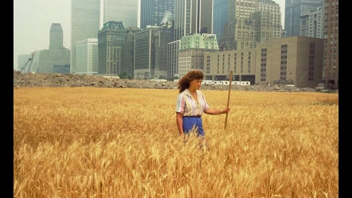 Настоящее пшеничное поле, засеянное на территории более гектара на месте свалки сразу за башнями-близнецами было необычной инсталляцией художницы Агнес Денес (на фото). Целью было рассказать о расточительности, бесхозяйственности, голоде в мире и проблемах экологии. Ведь стоимость земли, на которой находилась свалка достигала 4,5 млрд. долларов.
