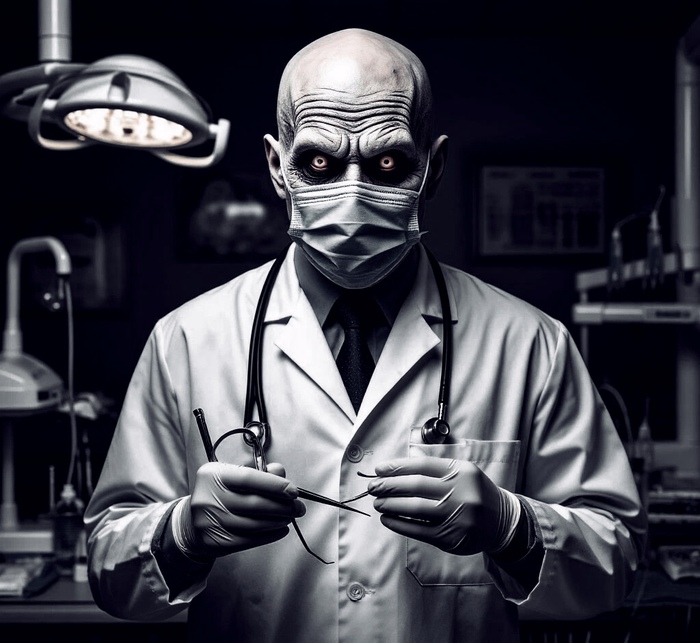 Тот стоял на пороге в белом халате, его лицо скрывала темнота. В руке он держал окровавленные щипцы.