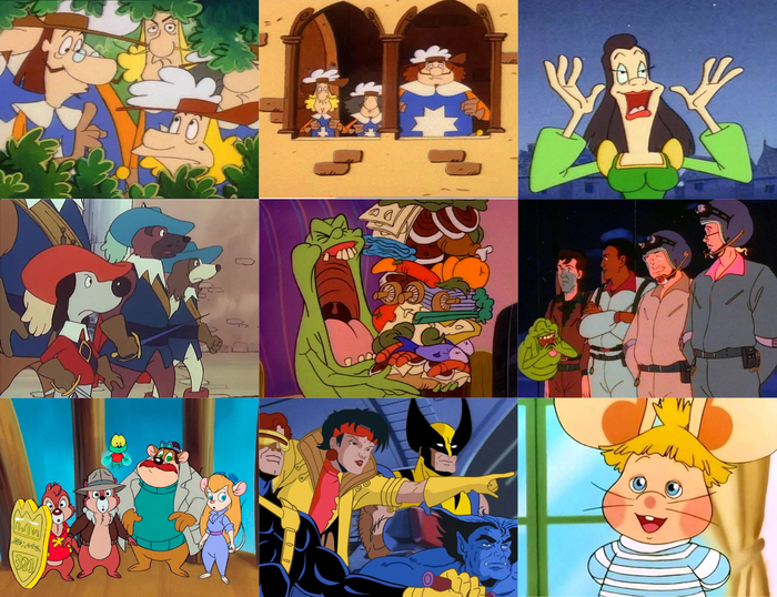 Коты быстрого реагирования (1993-1995), Приключения Тинтина (1991-1992), Легенды острова сокровищ (1993-1995), Легенда о принце Валианте (1991-1994), Питер Пуш (1992-1995), Настоящие охотники за привидениями (1986-1991), Приключения мишек Гамми (1985-1991), Альберт – пятый мушкетер (1993-1995), Битлджюс (1989-1991), Джуманджи (1996-1999), Д’Артаньгав и три пса-мушкетёра (1981-1982), Трансформеры: Битвы зверей (1996-1999), Геркулес (1998-1999), Пираты темной воды (1991-1992), Чудеса на виражах (1990-1991), Русалочка (1992-1994), Черный Плащ (1991-1992), Утиные истории (1987-1990), Чип и Дейл спешат на помощь (1989-1990), Люди Икс (1992-1997) + Топо Джиджио (1988) из совсем раннего детства.
