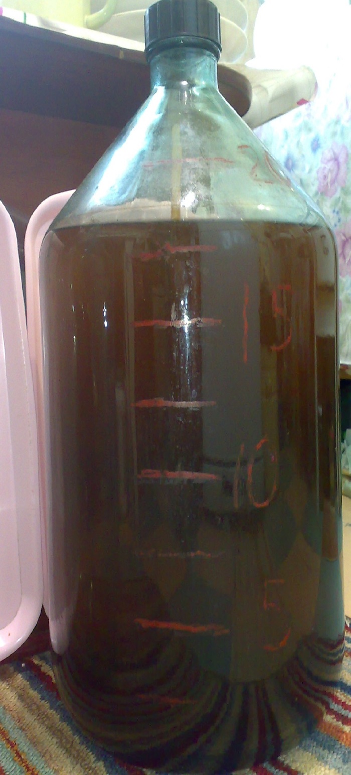 За почти месяц в бутыли нет даже намёка на оседание (обычно за 3-4 дня оседает). Попробовал процедить, марлевый респиратор после пропущенного через себя литра раствора напрочь забивается коричневой взвесью, т.е. даже процедить не удаётся.
