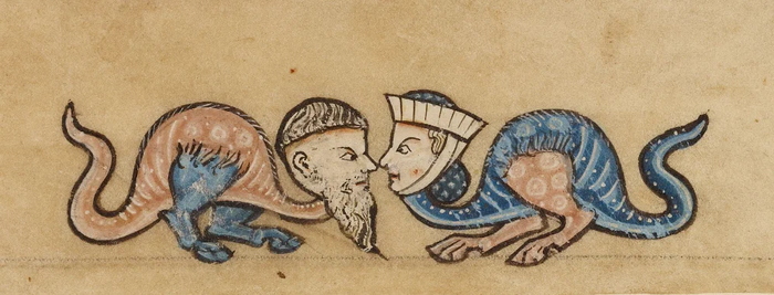 Что там приходило в голову монахов-переписчиков, мы, к сожалению, уже не узнаём. Не всё так однозначно и всё такое прочее. Однако, исследователи обнаружили ряд интересных закономерностей среди этих рисунков. Практически каждый переписчик оставлял дролери в своих работах, и обычно у них был ряд общих тем. Существует мнение, что тем самым скучающие монахи комментировали написанное, рассказывали о своих мыслях или просто «общались на втором слое». Ну типа как мы рисуем эмодзи фейспалма, после чье-нибудь тупой цитаты. А монахи в подобной ситуации часто ставили, например, человека, который играет задницей не трубе. Ну да-да, «как в лужу пернул», говорят у нас в таких случаях.