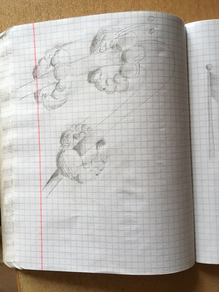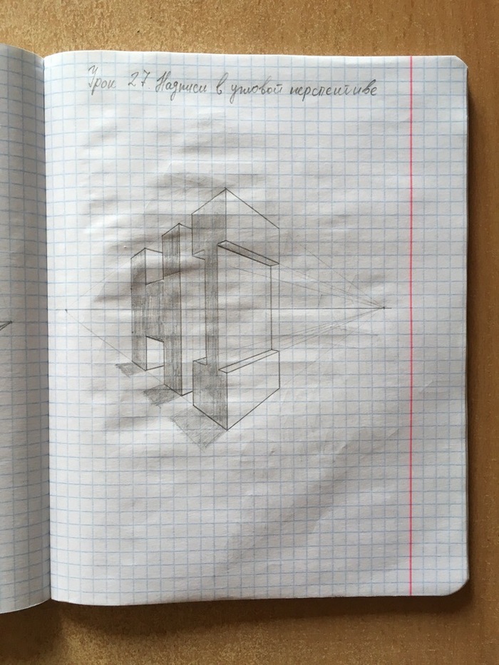 Дальше были уроки с перспективой. Я не буду тут особо ничего показывать, потому что для меня главным было не тратить на них время (на них его уходило много), а понять суть точки схода и принципы размещения объектов. Прикреплю только рисунок с объемным текстом, который тоже был понят не сразу, но упорство пересилило. Все эти уроки я делал без использования линеек и прочего. Только карандаш.