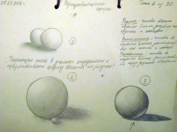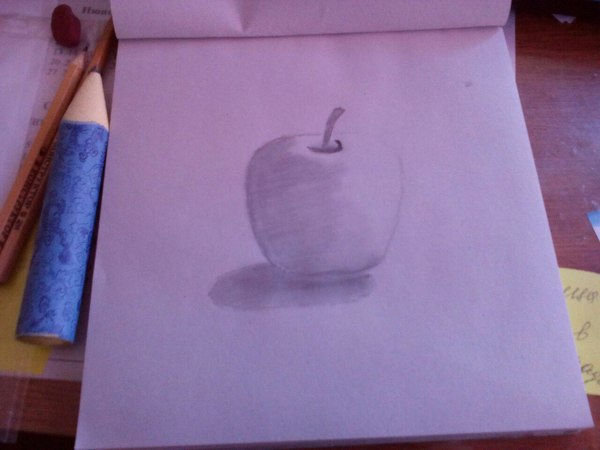 Затем, собственно, начинаются азы - осваивание светотени и источника света. Первый урок - нарисовать окружность, затенить ее в соответствии с воображаемым светом. Доп.задание (которое есть после каждого урока и, в принципе, к выполнению необязательно) - нарисовать яблоко.