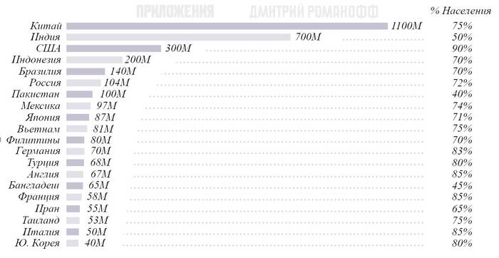 Количество пользователей смартфонов в разных странах мира