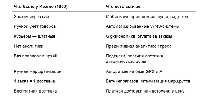 Kozmo не додумался до многих вещей типа гиг-работников, а многие не мог себе позволить — не было инфраструктуры. Всё делалось в лоб, вручную. Они изобрели идею — но технологии не догнали.