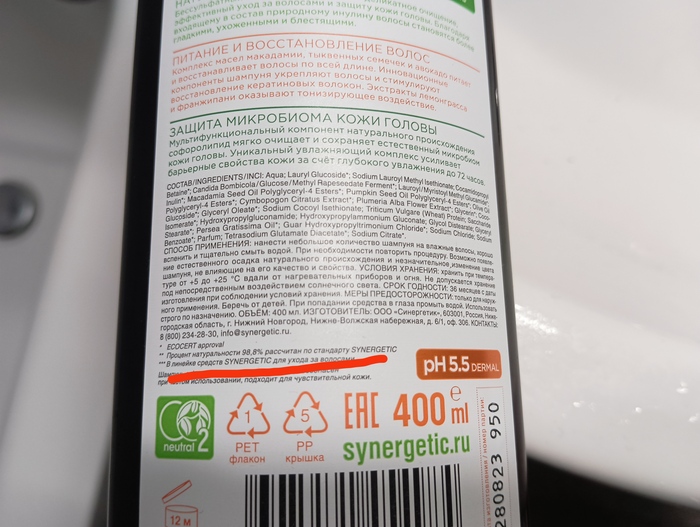 Причем у шампуня "натуральность" 98.8%? Наверно во флаконе просто вода, уголь и животный жир + отдушка подумал я!