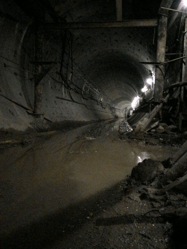 На двух фотографиях ниже вы можете увидеть уже почти готовый перегонный тоннель. Нашей задачей на этом участке был вынос полигометрических знаков.