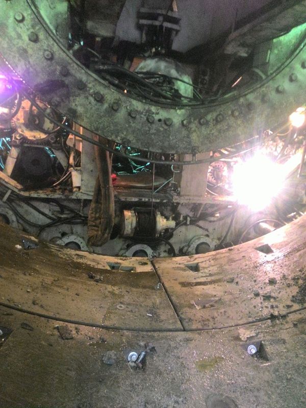 Вид изнутри. В зазоре видно домкраты, опирающиеся на кольцо, так щит и проходит дальше вперёд.