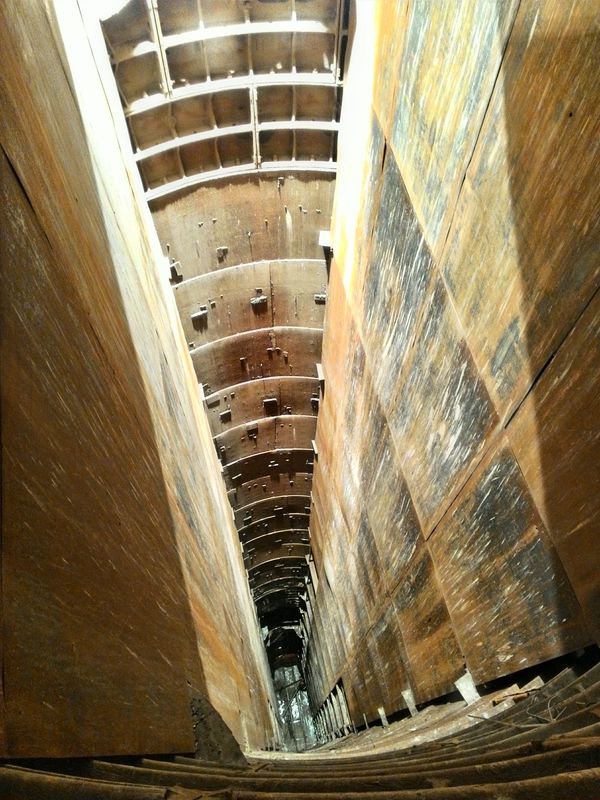 А это забой вентиляционной шахты, круглые ребристые кольца по границам тоннеля называются тюбингами. Вы их можете видеть, если приглядеться в окно поезда в метро в некоторый перегонки. Наша задача - контролировать, чтобы строители устанавливали их без отклонений от оси тоннеля, а то хрена знает, куда этот тоннель уйдёт :)