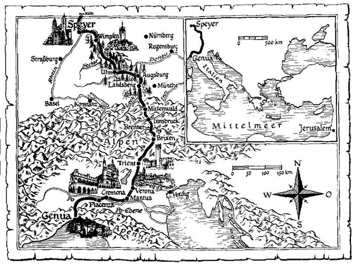 Спуск был неимоверной радостью. Зелень! Серебро рек! Многолюдные селения, виноградники, цитрусовые, разгар роскошного лета! После Альп в живых остался лишь каждый третий участник похода. Но оставшиеся, воспрянув духом, думали, что все горести уже позади. В этом изобильном краю их, конечно, обласкают и откормят.