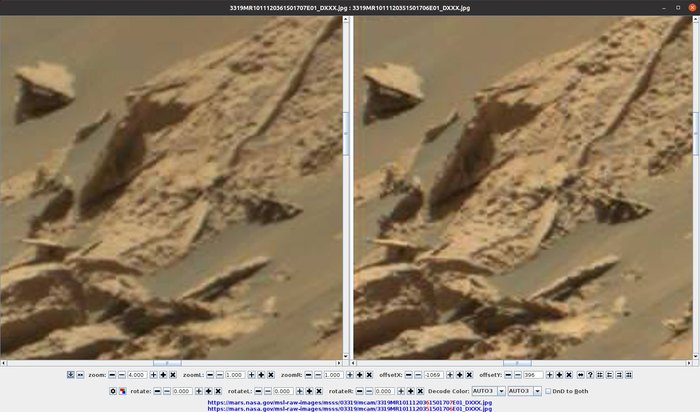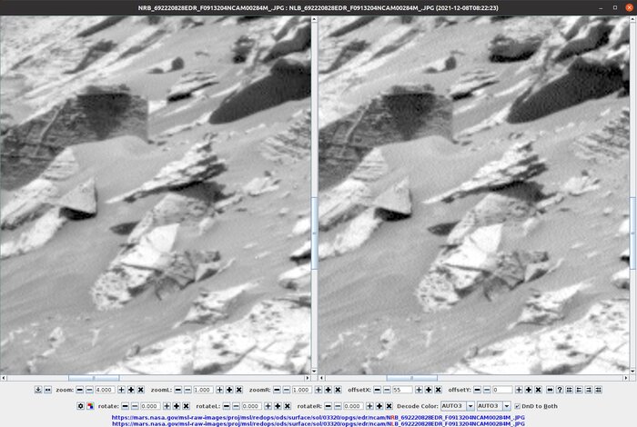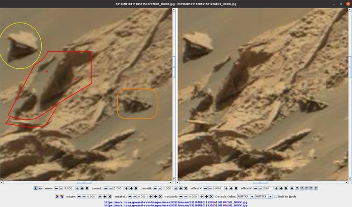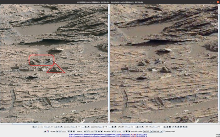 А вот "листовой материал". Воображение дорисовывает правильный треугольник, но на самом деле мы видим только один угол, он закругленный, с отверстием в центре радиуса закругления. Почти полностью мы видим только одну сторону треугольника, две другие стороны частично скрыты песком, но то, что мы видим -- это прямые ровные грани. Судя по снимку, "треугольник" имеет отинаковую толщину и погнут. Под "треугольником" находится еще один объект, в котором угадывается прямоугольная форма. На верхней стороне объекта имеются выступающие детали. (В принципе, можно пофантазировать, что это был арбалет, а слева сверху лежат остатки хвостового оперения стрелы. Для арбалета тут деталей не хватает, хотя рядом можно найти детали, которые непонятно где были, например, заостренная на конце полоска материала постоянной толщины. В любом случае, это не типичные для камней формы. И "просто палка" на Марсе означает обнаружение прошлой жизни.)