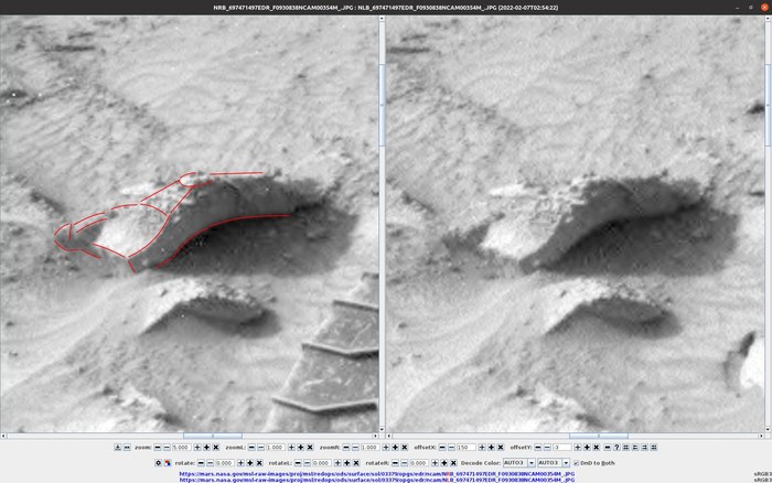 А вот странный объект, по форме напоминающий земного моллюска. Слева там даже есть подобие сифона (дыхательной трубки). Скорее всего это не моллюск, а что-то, чего мы вообще не можем себе представить, но надо признать, что объект странный, он состоит из трех частей: основного тела с отпечатком чего-то прямоугольного на обращенной к нам стороне (в центре), гладкого зажима (или ленты), и "хвоста" наподобие мочала или старой метелки. Слева имеется "сифон" (очень короткая трубка с отверстием или углублением), справа из "мочала" торчит еще одна трубка, длинная, хотя ее отверстия мы не видим. Curiosity Sol 3278.