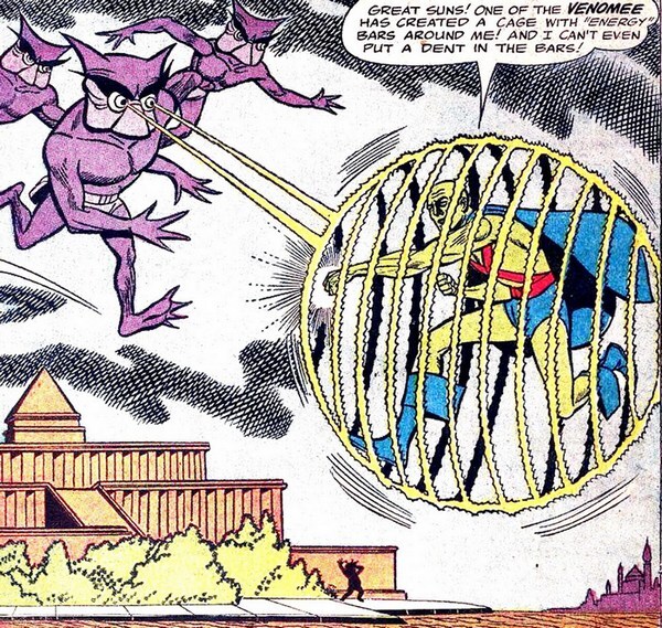 Но Веноми продолжают терроризировать людей, а когда Марсианин пытается их остановить, один из Веноми сооружает вокруг него энергетическую клетку. Даже силушки Марсианина недостаточно для того, чтобы из неё выбраться! И клетка всё сжимается и сжимается, скоро она и вовсе Марсианина раздавит! Дж´онн пытается превратиться в маленькую птичку, чтобы проскользнуть между прутьев, но клетка лишь быстрее сжимается. Тогда Зук, комичный спутник Марсианина, пользуется собственной силушкой, раскаляется и плавит энергетическую решётку, стараясь при этом не поджарить Марсианина. Но Веноми всё ещё буянят. Впрочем, теперь Марсианин знает, как их остановить. Веноми собирают ингредиенты для зелья, которое позволит им превратиться в людей и не помереть, но если они превратятся в людей раньше, чем выпьют зелье, будет им худо. Ход конём: Марсианин превращается в Веноми и приобретает все силы Веноми. В том числе способность превращать других. И он превращает Веноми в людей. И те исчезают с громким хлопком и небольшим задымлением.