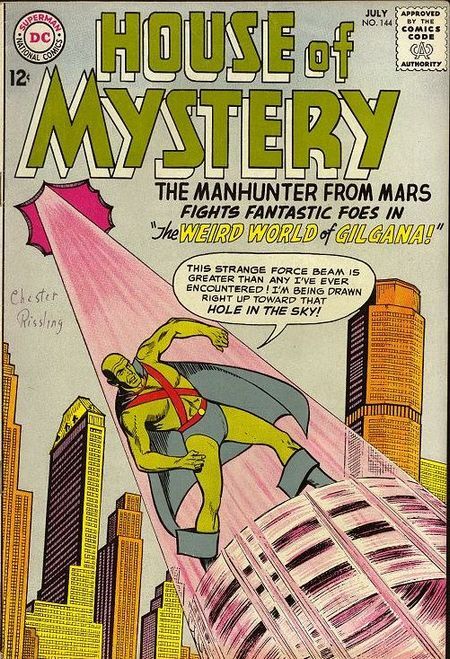 Но порой всем нужно подзаработать, так что начиная с выпуска House of Mystery #143 в Доме Тайн комнаты сдают супергероям, в частности – дебютировавшему в другом комиксе герою, созданному исключительно для того, чтобы как-то разбавить обилие Супермэна везде, Марсианскому Охотнику, Дж´онну Дж´оннзу. В истории от Джека Миллера с рисунком от Говарда Шермана. Где-то на свалке Глава Идола Диаболу (теперешний архивраг Марсианина) открывается и из неё выбирается чудище. Это засекают Дж´онн Дж´оннз, Охотник с Марса, и его маленький инопланетный спутник Зук. Они летят к месту происшествия, а там как раз перепуганный фермер стреляет в тварь. А та прикасается к фермеру и уменьшается в размерах. А вот фермер становится великаном и сходит с ума, и начинает всё вокруг крошить. Ну, Марсианин накидывает великану по сусалам, чтобы успокоить (силушки хватит, потому что по силам пока что Марсианин на 95% тупо Супермэн – суперсила, неуязвимость, полёт, суперзрение и супердыхание, плюс “отсебятины” способность проходить сквозь стены).