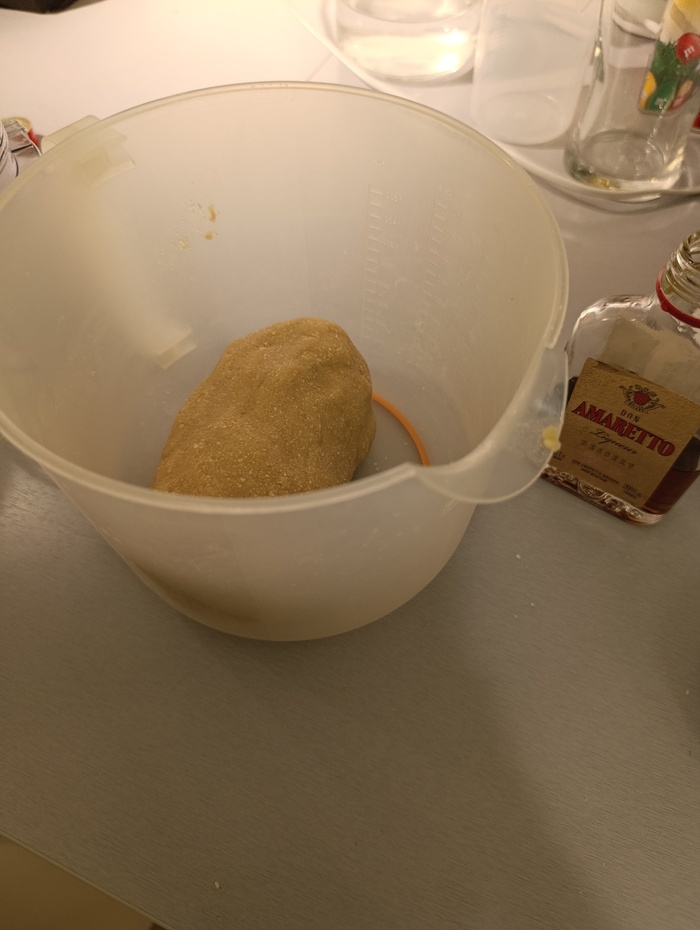 Я взяла ликер а-ля амаретто, потому что у него тоже миндальный вкус и в составе эссенция миндаля, так что это мне подходит. Нужно вылить 50-100 мл в смешанную массу миндаля и сахарной пудры и замесить тесто. Количество жидкости смотрите по желаемой густоте. В моем бруске 100 мл. Тесто должно быть эластичным, не сыпаться, но нормально формоваться, а не быть как каша. Месить долго не надо, как только получается сделать колбаску, можно остановиться.