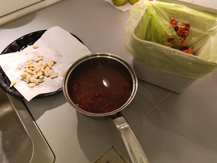 С орехов нужно снять кожицу. Это, пожалуй, самый трудоемкий процесс во всем приготовлении. Вы спросите: боже, как их чистить, это же уму не постижимо, кожица намертво припаяна к ореху! Так и есть. Но имеется лайфхак: кладёте орехи в холодную воду, ставите нагреваться, доводите до кипения, ждёте минуту и ополаскиваете орехи холодной водой, оставляя их там плавать. Всё, кожица очень легко отходит от ореха. Но почистить нужно каждый так, чтобы не повредить ядро.