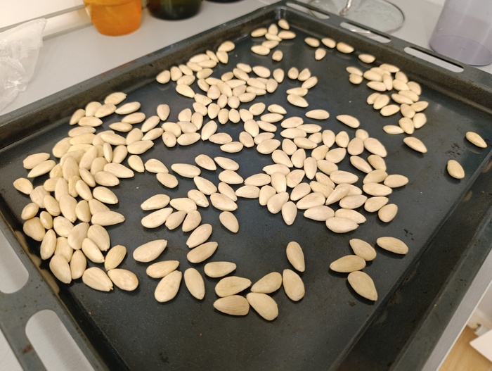 Выкладываем очищенный орех на салфетку, чтобы удалить лишнюю жидкость. А после - на противень и в разогретую духовку при 180 градусах минут на 5-7. Орехи не должны поджариться, а только подсохнуть.