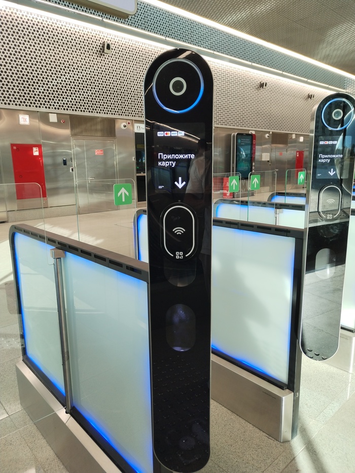 Турникет выглядит футуристично. Дверки турникета стеклянные, стенки турникета видимо тоже, внутри подсветка. При открытии - зеленый цвет подсветки, в состояния закрытия - голубой. Красиво. 😍