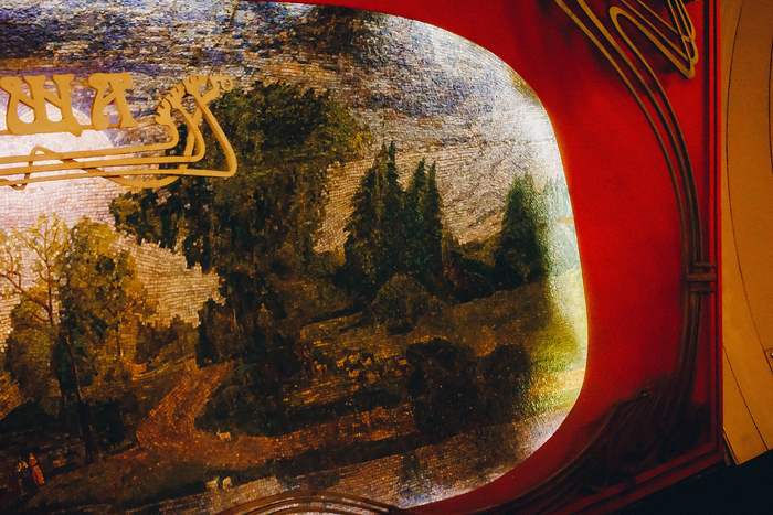 Над сценой ДК гордо возвышается герб канувшего в лету Советского Союза. МИИТовцы любили свою историю, поэтому берегли каждую мелочь в своем Дворце, вплоть до оригинальных дверных ручек и старых репродукторов.