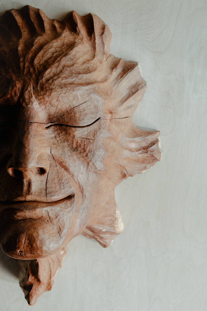 Материал ясень, выполнил с торцевой стороны (остаток бревна от прошлой маски, та что "смотри внутри")
