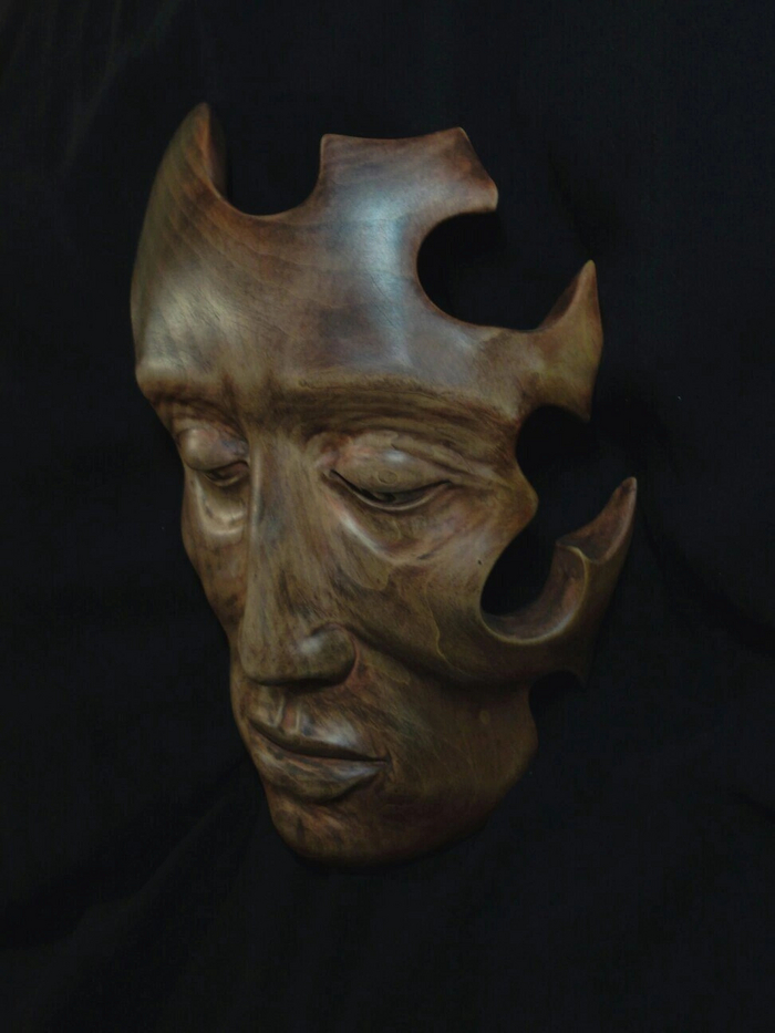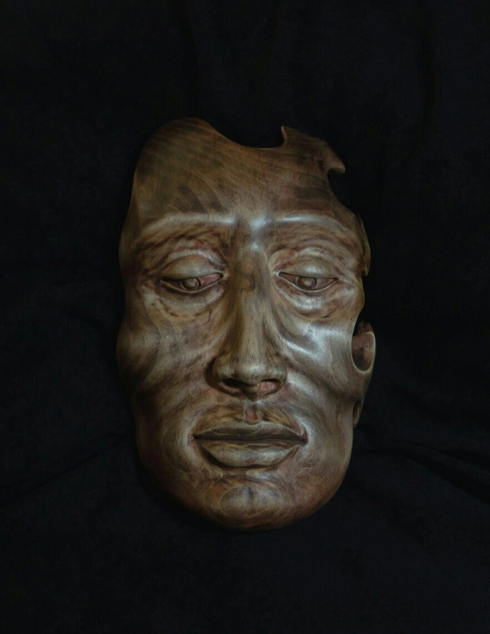 Маску подрезал по сторонам, вклеил вставки из березовой доски под нужным углом. Это увеличило ширину маски и глубину, соответственно. Вставкам, путем стесывания ненужного, придал искомую форму Осталось нанести на нее штрихи для обозначения бородатой растительности.