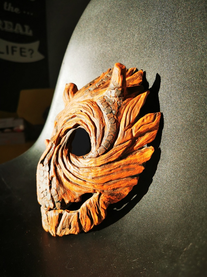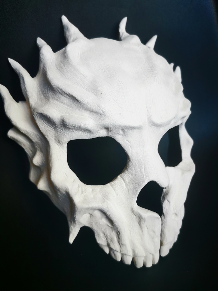 В итоге получилась вполне достойная (на мой взгляд) маска, для себя решил, что это эквивалент игровой маски Морокеи, которую можно добыть в квесте коллегии магов. Наверное при желании такую маску можно использовать в косплее, но у меня она просто как элемент декора висит на стене. Вот немного итоговых фото.