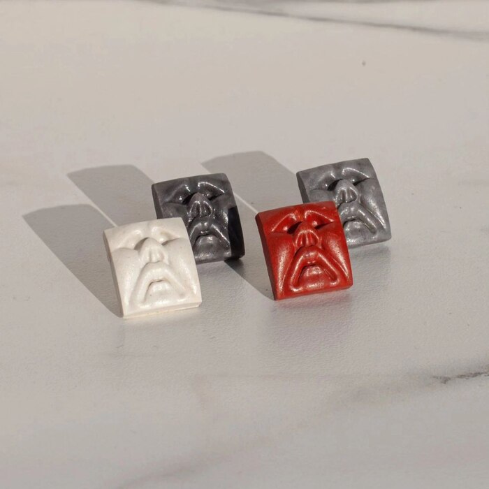Проникшись страданиями, запечатлёнными в их лицах, вдруг полюбил и сроднился с ними. Захотелось носить под сердцем, и делиться с другими. Много часов наблюдения и сравнения, привели к общему выводу: зубы должны быть. Дизайнер сделал 3D модель, далее был изготовлены силиконовые молды. Регина начала заливку, и добившись хорошего качества, мы приступили к поиску цвета. Было решено сделать 4 цвета: белый, кирпич, светло-серый, тёмно-серый. Они будут отлично смотреться на вашей любимой кофте, пальто, платье, лацкане пиджака. Значки покрыты лаком и никакой ветер или дождь не испортит их. К этой работе руку приложили дизайнеры, мастера. А маскароном "рожей" вдохновилась вся наша команда, друзья, родственники.