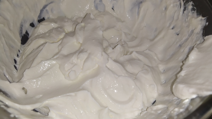 Пока блины остывают, займемся начинкой. Начинки будет два вида. Первая, сливки взбитые с сахарной пудрой. Взбиваем до хорошей плотности.