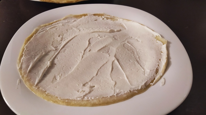 1) Блин намазываю тонким слоем творожной пастой и скручиваю в трубочку.