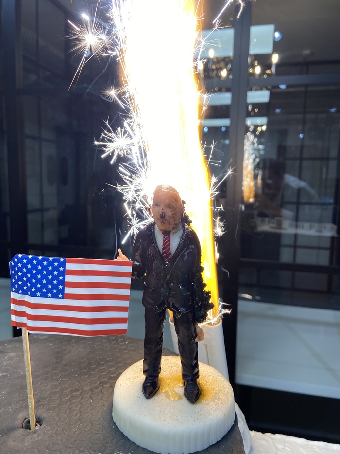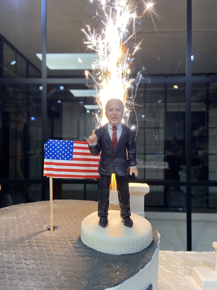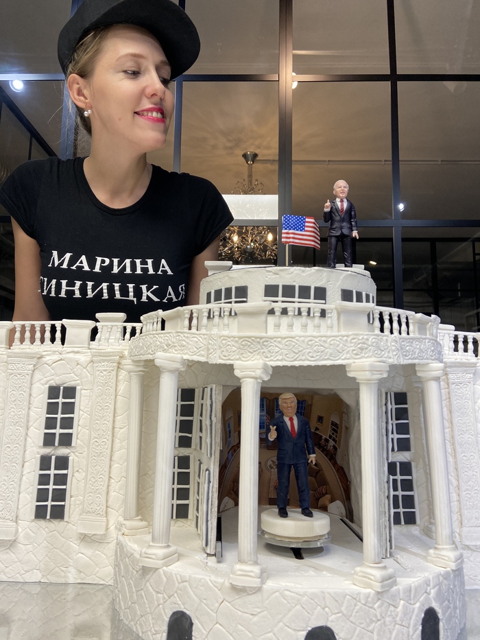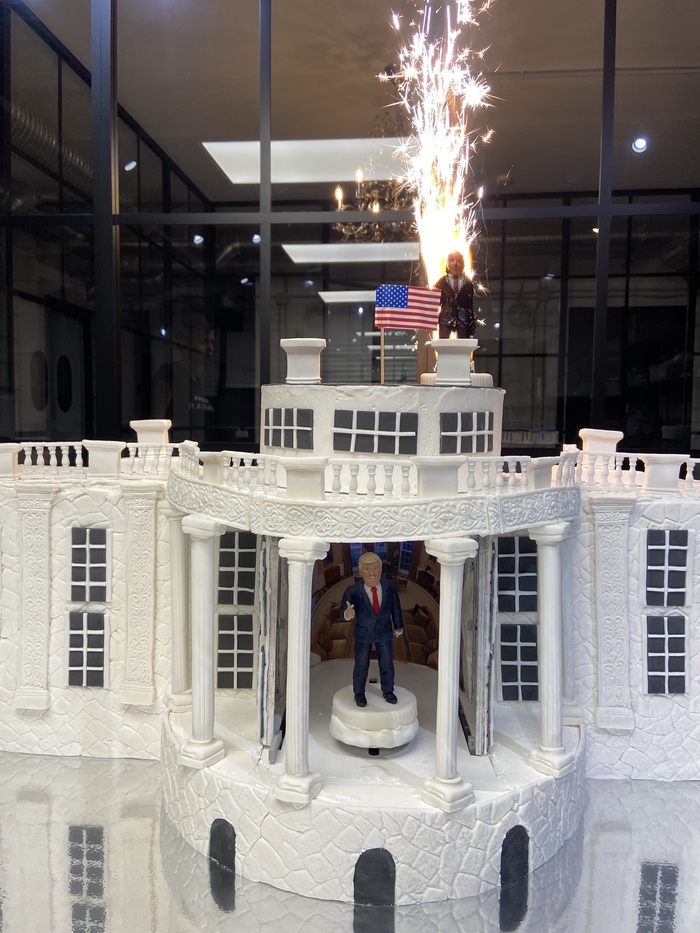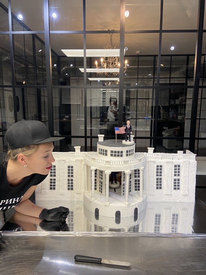 Выглядит как Белый дом, наверху стоят 2 кандидата. Начинка в цвет флага США: красный бисквит, белый крем, прослойка голубики (синий цвет).