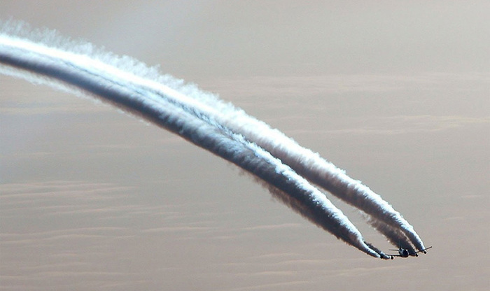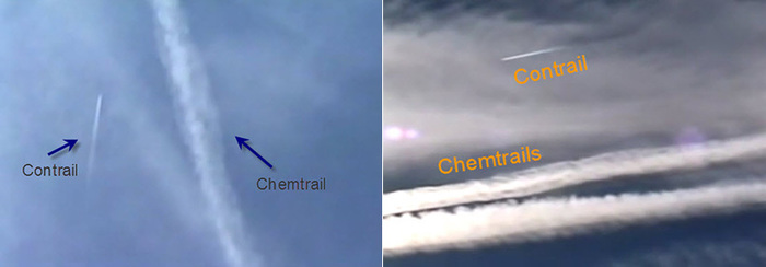 Есть вполне определенные различия в природе формирования, развития и поведении этих явлений, которые дают возможность проводить между ними четкую границу. Обычные самолетные выхлопы состоят из ледяных мельчайших кристалликов, которые образуются на высотах более 10 километров. На более низких высотах они просто не могут сформироваться вне зависимости от типа и скорости самолета. На высотах более 10 километров выхлопы кажутся тонкими заостренными линиями (если наблюдатель смотрит вертикально вверх, перпендикулярно положению самолета). Обычно они испаряются в течение минуты и очень редко простираются на достаточное расстояние позади самолета.