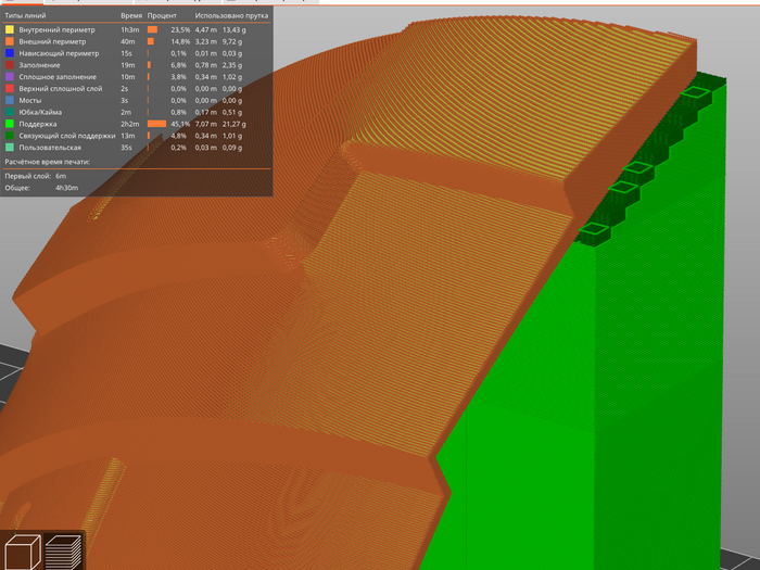 Во втором случае злую шутку сыграла малая толщина детали в верхней части и, видимо, недостаточный обдув. Разместив поддержки только в верхней части модели без поддержек осталась боковая грань, угол которой с увеличением высоты и угла наклона начал задираться вверх и в какой-то момент печатная голова смогла таки сбить деталь соплом со стола.