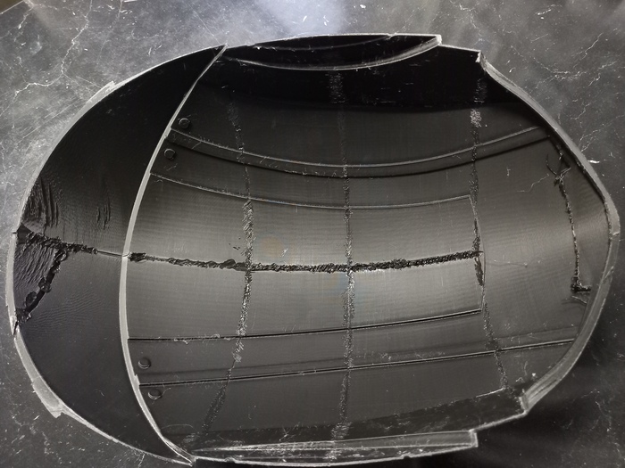 На этом же этапе я приваривал и различные мелкие фрагменты, которые печатал отдельно для бракованных деталей. Вот так шлем стал выглядеть после того, как были сварены вместе все его части: