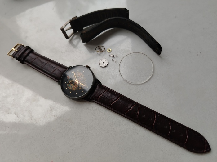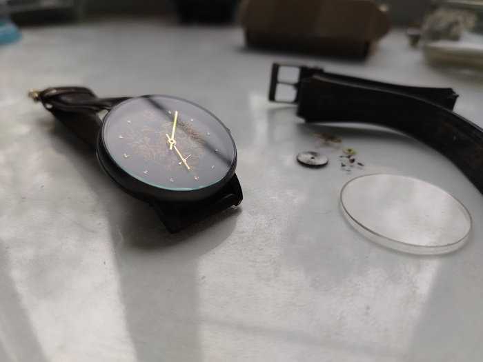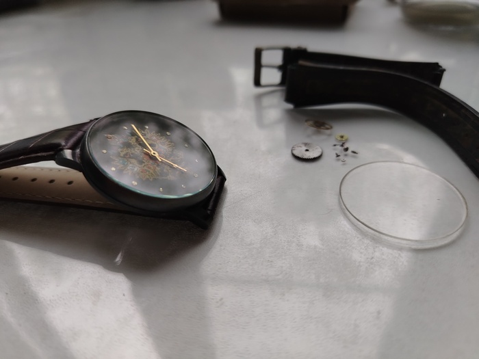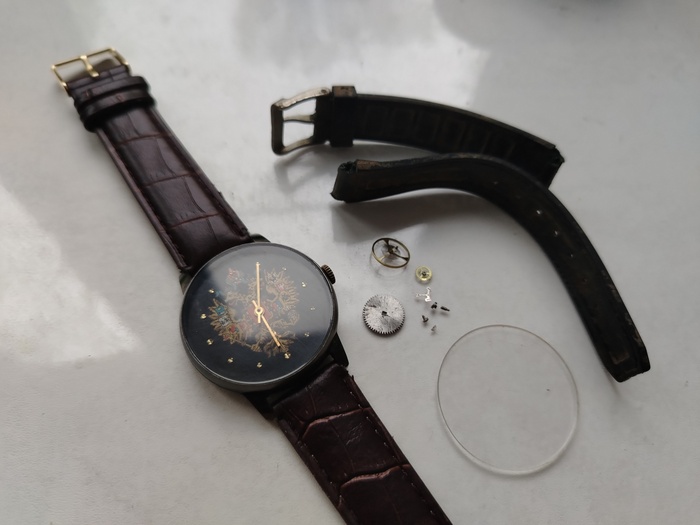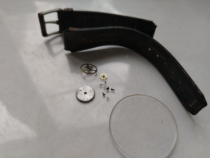 Ну а стекло вместо пластика приклею новое минеральное, ремешок который был у меня, и все что рядом справа от часов, это все в утиль как негодные часовые узлы.