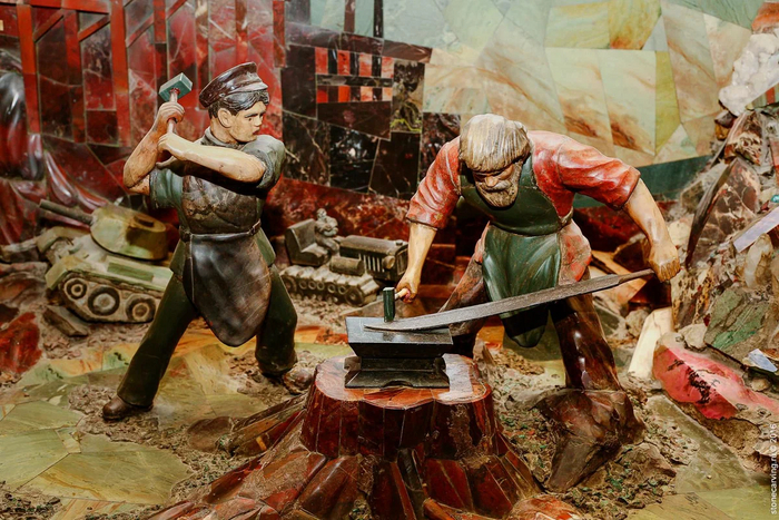 Урал кует Победу". Композиция в технике объемной мозаики выполнена учащимися Екатеринбургского художественного ПТУ № 42 под руководством известного камнереза Н. Татаурова. 1948 год.
