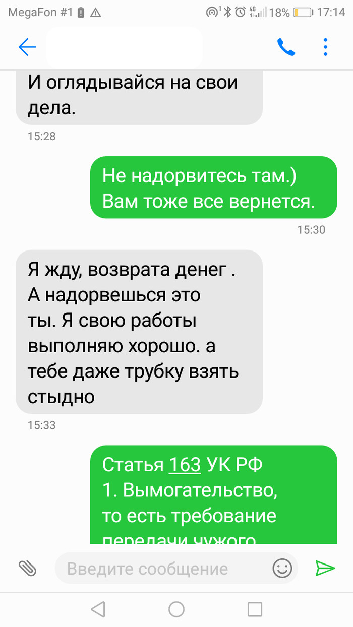 В течение следующих нескольких месяцев я получил от Заказчиков требования вернуть 10 000руб. за "недоделанный ремонт", угрозы и оскорбления.