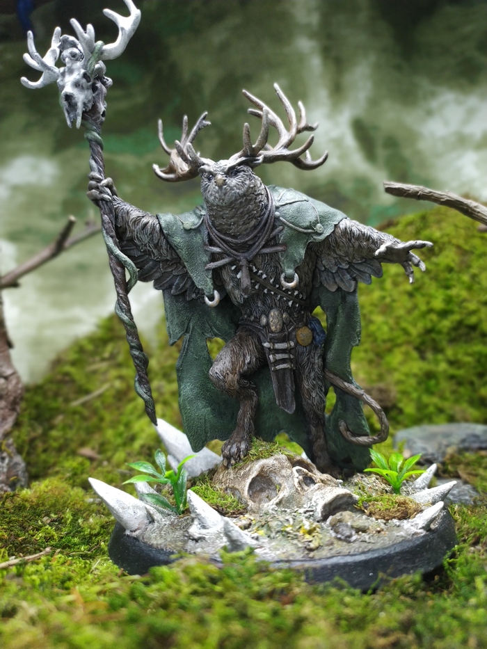Одна из последних работ мастерской по окраске миниатюры. Дриуид-оборотень (высота фигурки 13см) декорации - ручная работа из натурального мха и деревьев (часть объёмного террейна клуба)
