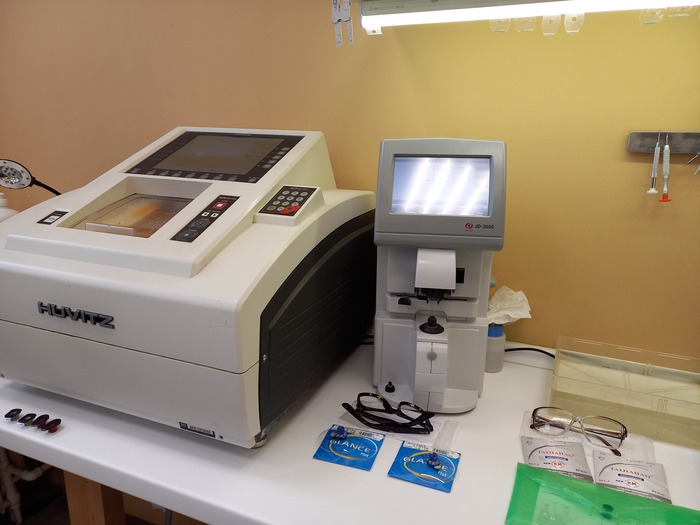 Сперва из оправы извлекаем шаблоны(если она новая) или старые линзы(оправа б.у.) чистим ультразвуком( процесс чистки не заснял, т.к неприятный звук). Это такая ванночка со специальной смесью, но как правило там вода и жидкое мыло. Далее отправляем в сканер для передачи формы в станок по обработке линз.