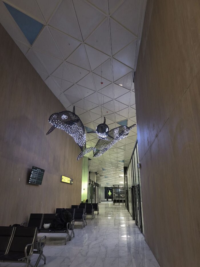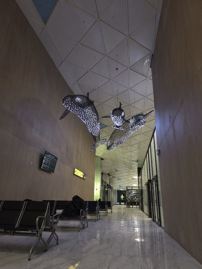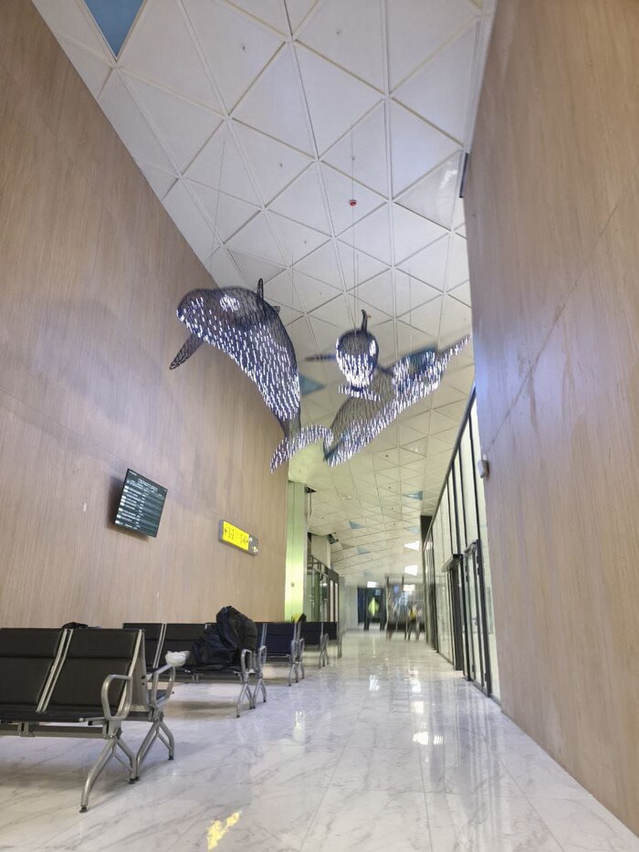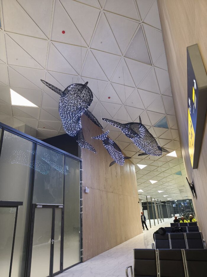 Эта впечатляющая работа длиной 15 метров воплощает грацию и мощь морских гигантов. Чёрный цвет придаёт композиции таинственность и глубину, подчёркивая изящность линий и форм. Светодиодная подсветка выделяет анатомическую красоту этих прекрасных и одновременно беспощадных хищников.