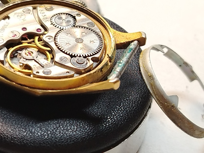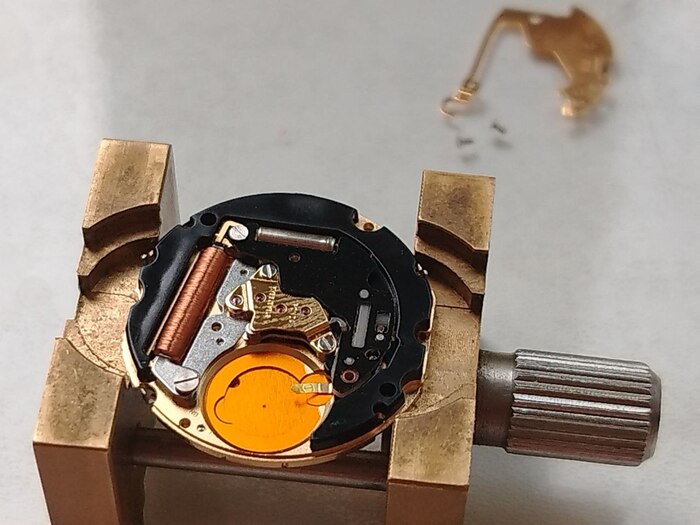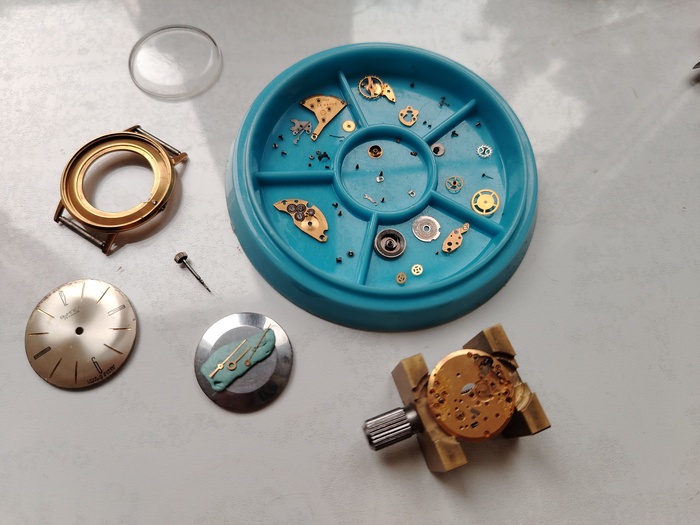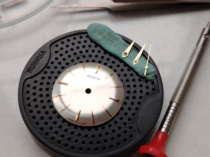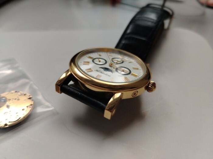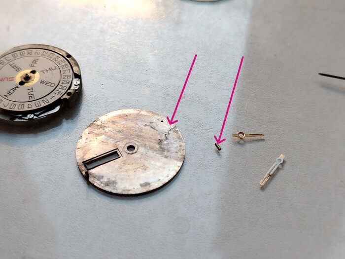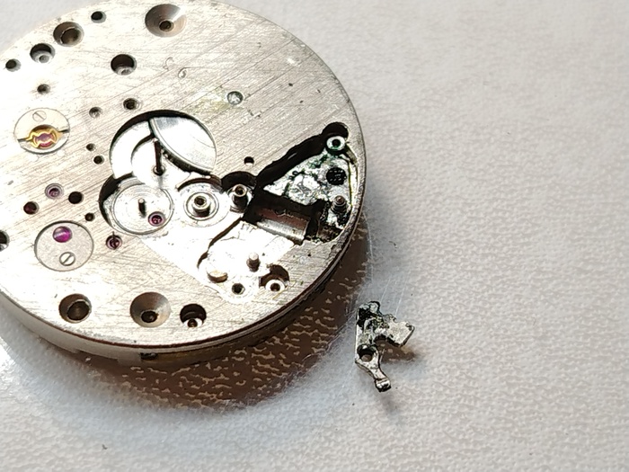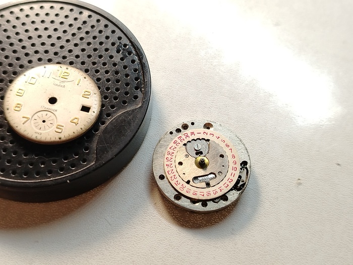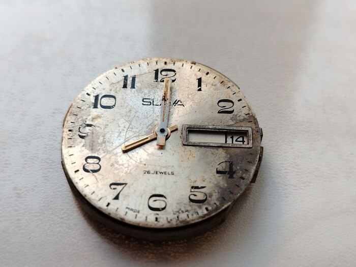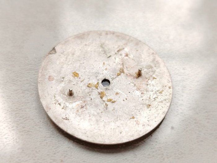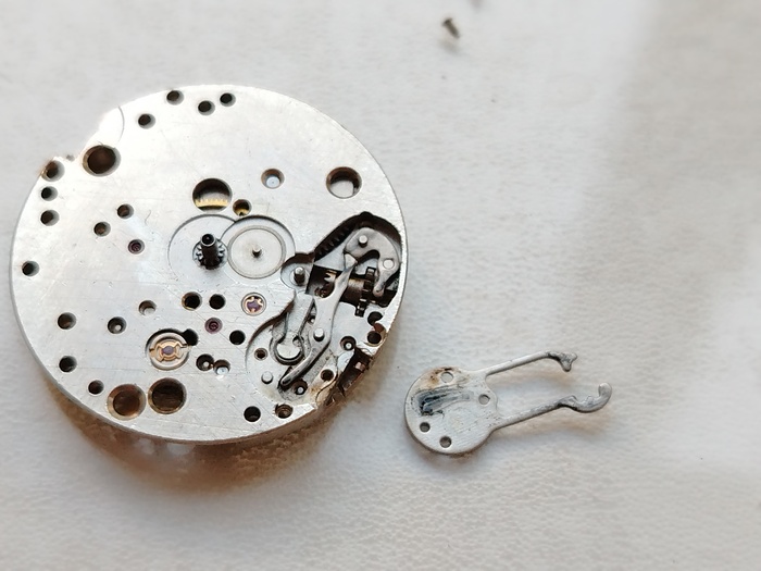 Тем более циферблат полноценно не крепиться к механизму, из за сломаной ножки крепления.