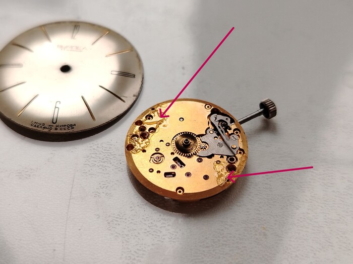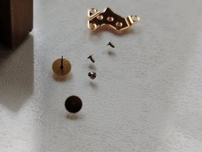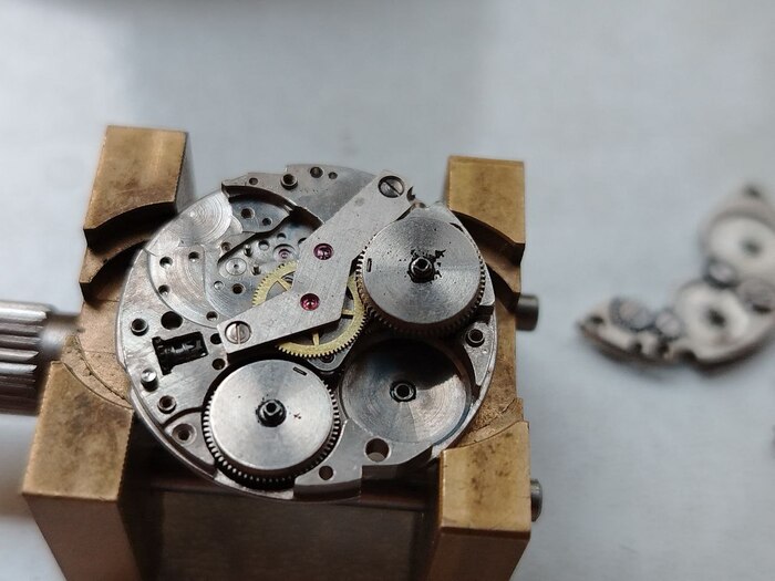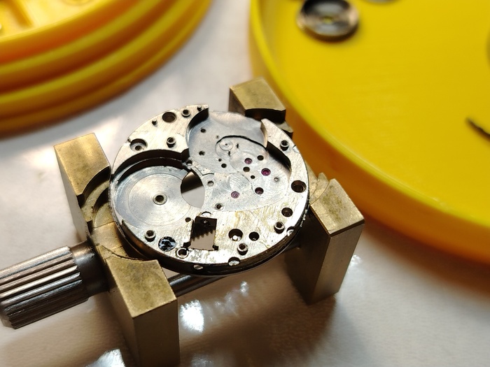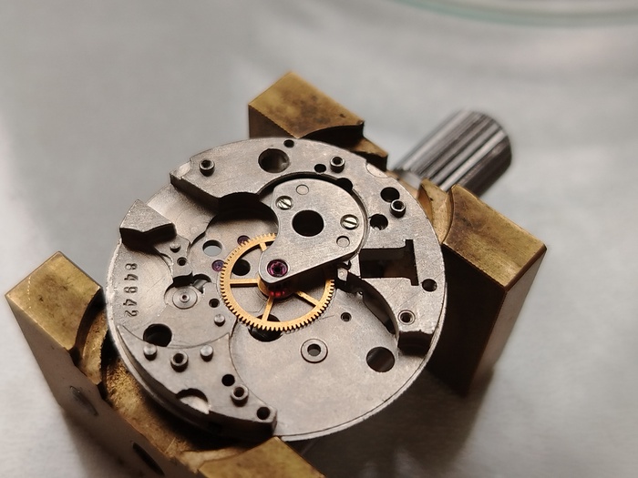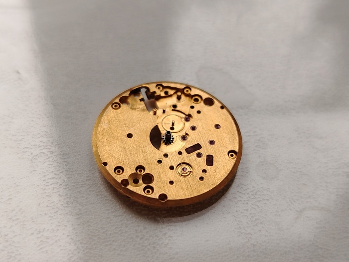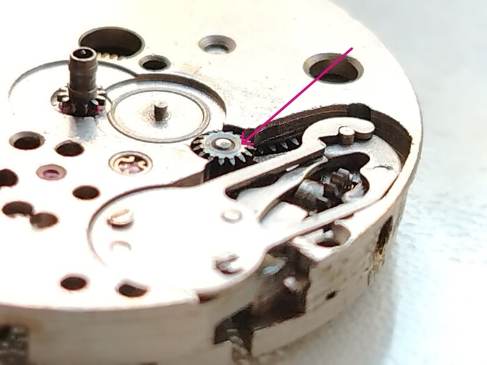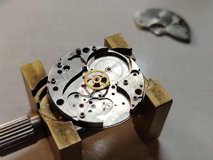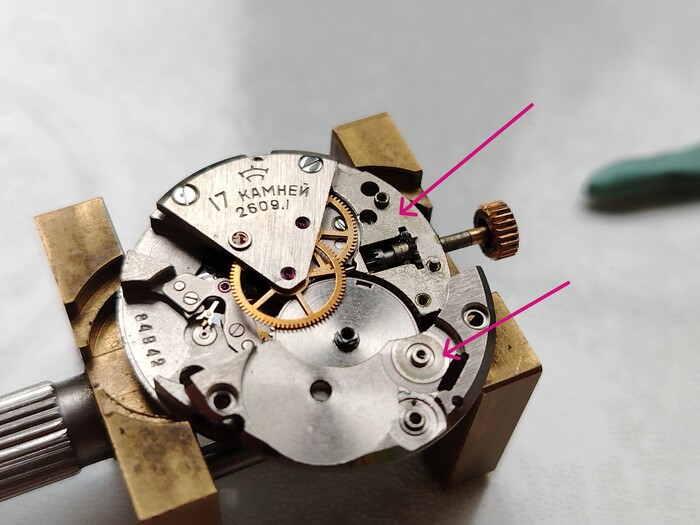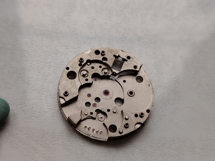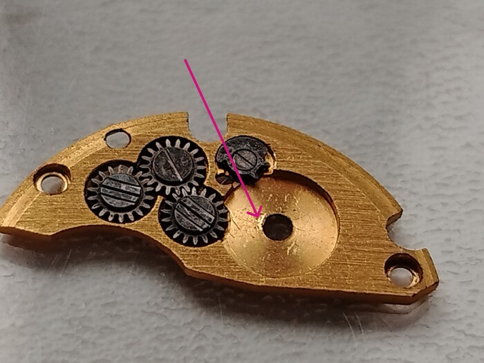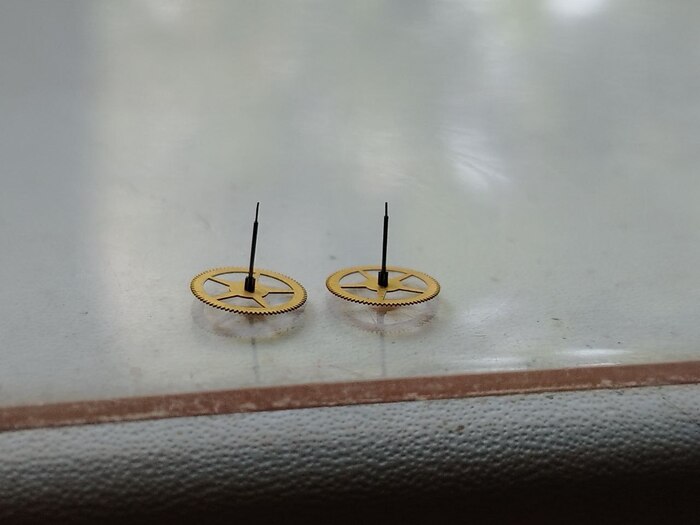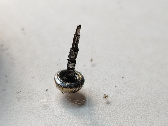 Справа центральное колесо в утиль, так как конечник на которое надеваем секундную стрелку обломлена чуть чуть.