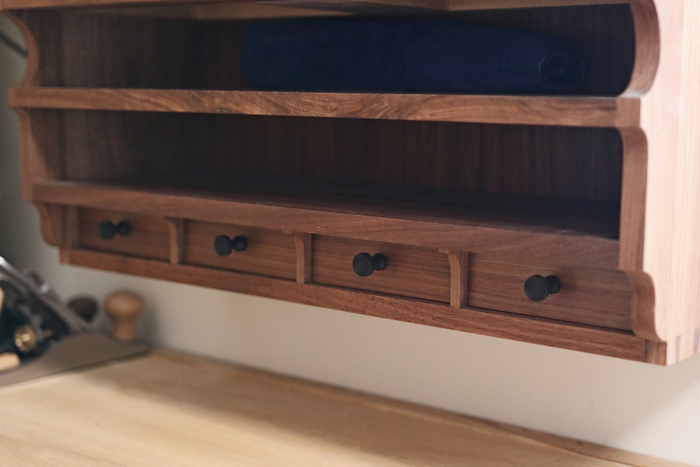 Кабинет выполнен преимущественно из массива американского ореха, полностью вручную. То есть черновая заготовка и раскрой деталей, конечно, осуществлялась на станках, но чистовое строгание, торцевание, соединения - только вручную, классическими методами.