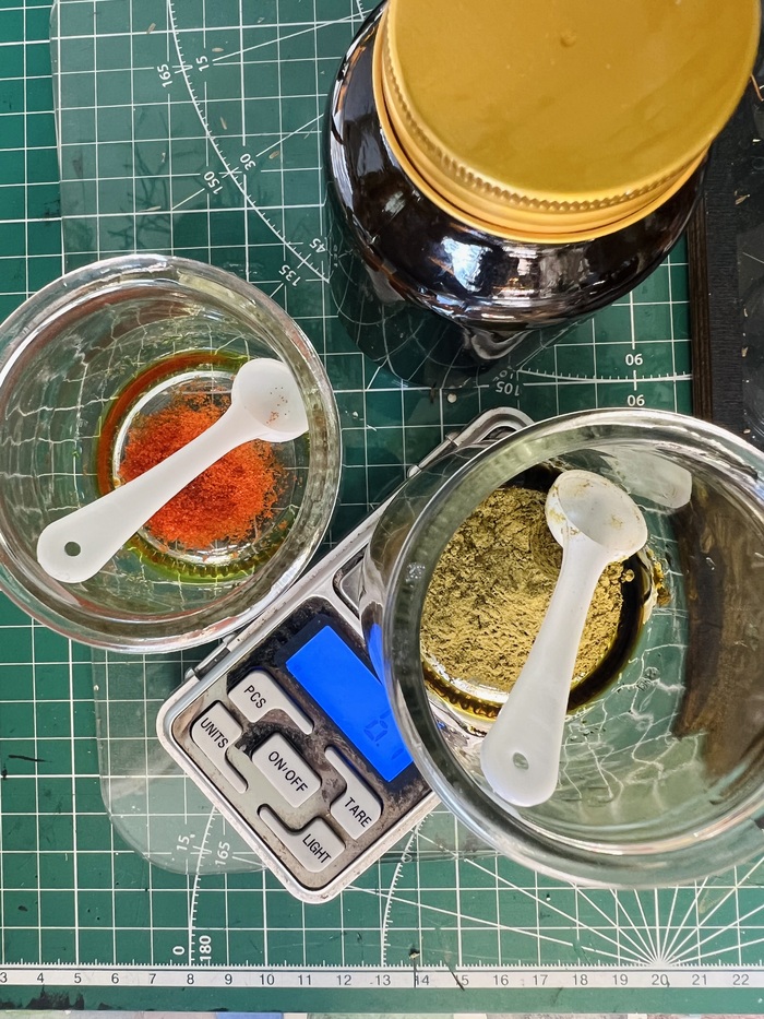 Готовим растворы. 2г лимонноаммиачного железа растворяю в 25мл воды, 5г феррицианида калия растворяю в 25мл воды. Далее растворы смешиваются в равных пропорциях и наносятся на ткань/бумагу. Получающаяся эмульсия светочувствительна, лучше задернуть шторы, чтоб не слишком быстро темнела.