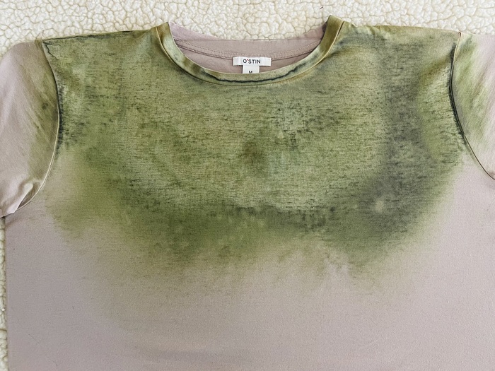 Теперь хорошенько полощем изделие в проточной холодной воде до прозрачности, закрепляем перекисью. Я опрыскала влажную футболку из пульверизатора и снова прополаскала. Сушим. Надеваем) Принт не переживает контакта с отбеливателем, так что стрираем аккуратно.