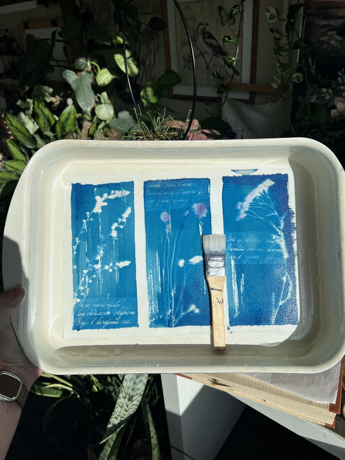 По истечении времени экспонирования достаем лист бумаги и отправляем под проточную воду. Остатки соли вымываем в слабом растворе лимонной кислоты. Я делаю это с помощью кисти. В конце отправляем лист в ванночку с раствором перекиси водорода, примерно столовая ложка на литр. Это окончательно проявляет и закрепляет изображение. Сушим. Радуемся результатам)