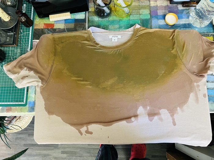Наносим эмульсию на ткань. Тут можно проявить фантазию, смачивать края пятна чистой водой, делать набрызг, короче ни в чем себе не отказывать. Сушим. Я сушила феном в ванной, чтоб не засвечивать.