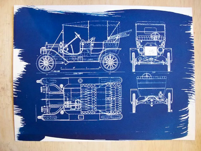 Главный практический прорыв цианотипии случился позже, в 1870-х - XX веке, когда инженеры и архитекторы поняли: это же идеальный и дёшевый способ копировать чертежи. Так родились знаменитые «синьки» (blueprints). Чертеж наносился тушью на прозрачную кальку, а потом копировался на светочувствительную бумагу. На выходе получалась синяя копия с белыми линиями.