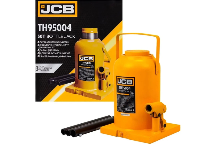 Бутылочный гидравлический домкрат от бренда JCB с грузоподъемностью до 50 тонн. Мощное и надежное средство для поднятия и удержания автомобилей.
