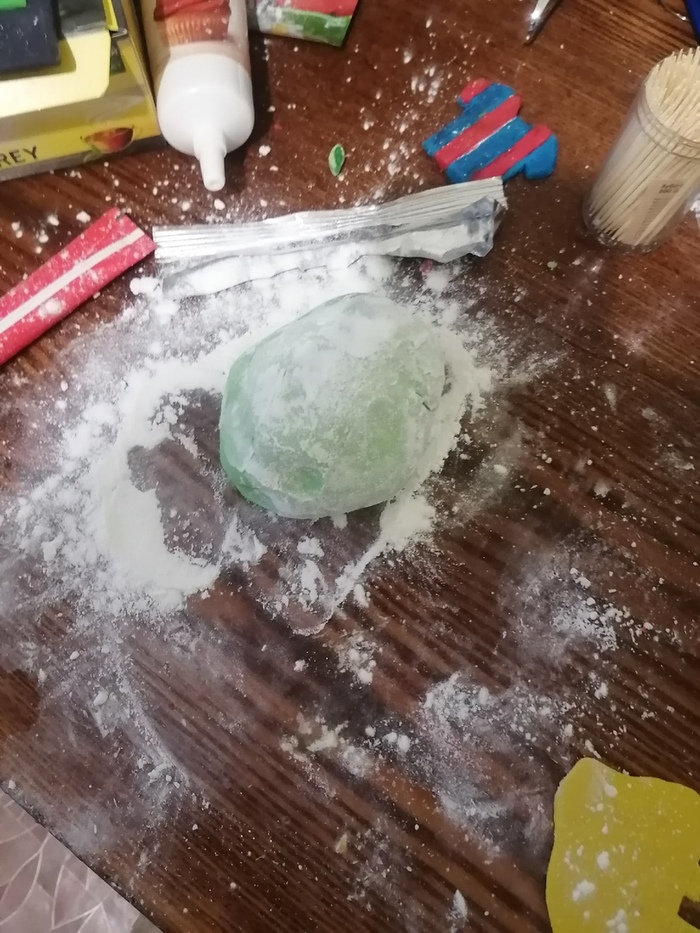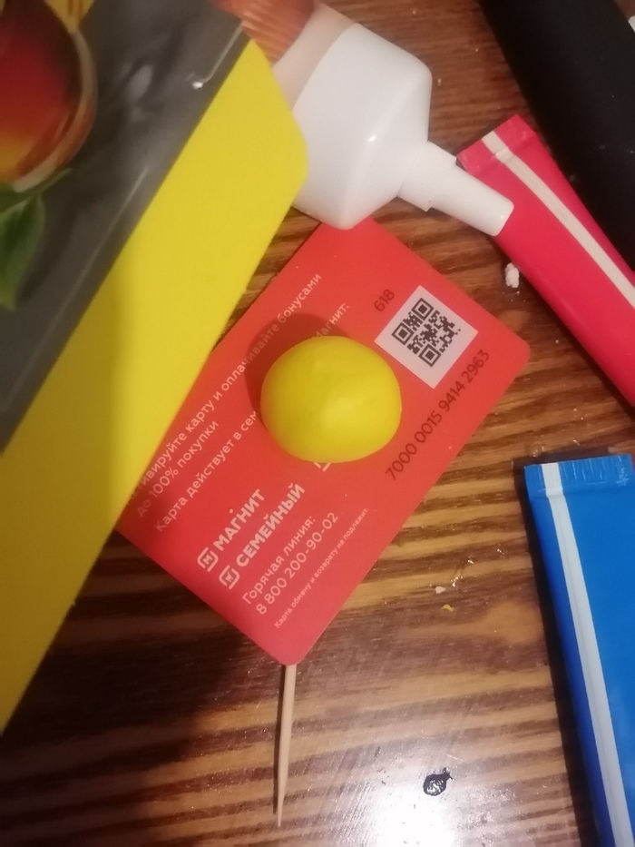 Ножика для пластилина у нас тоже не оказалось по этому резали не нужной карточкой и зубочистками. Покупная мастика очень быстро подсыхает и её нужно разминать руками. по этому совет: берите столько мастики сколько вам нужно на данный момент, всё остальное лучше хранить в плотном пакете с минимальным количеством воздуха.